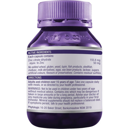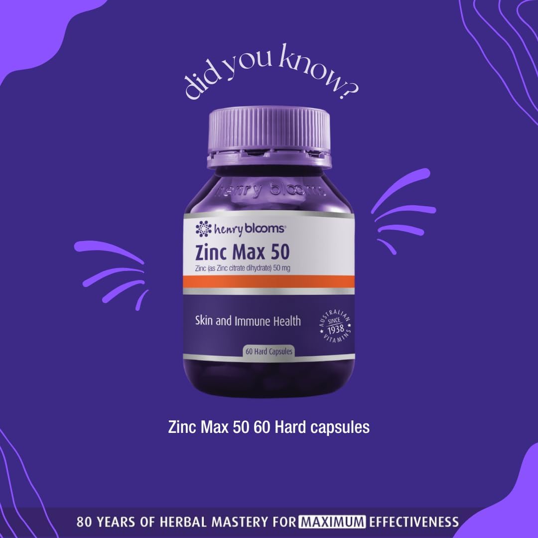 Henry Blooms Zinc Max 50 is a high strength, once a day Zinc supplement beneficial for development and proper functioning of the reproductive system, the immune system and skin repair. Zinc is essential for the formation of connective tissue, teeth, bones, nails, hair and skin and plays an important role in collagen formation. Zinc can also reduce the severity and duration of colds and support cardiovascular health.