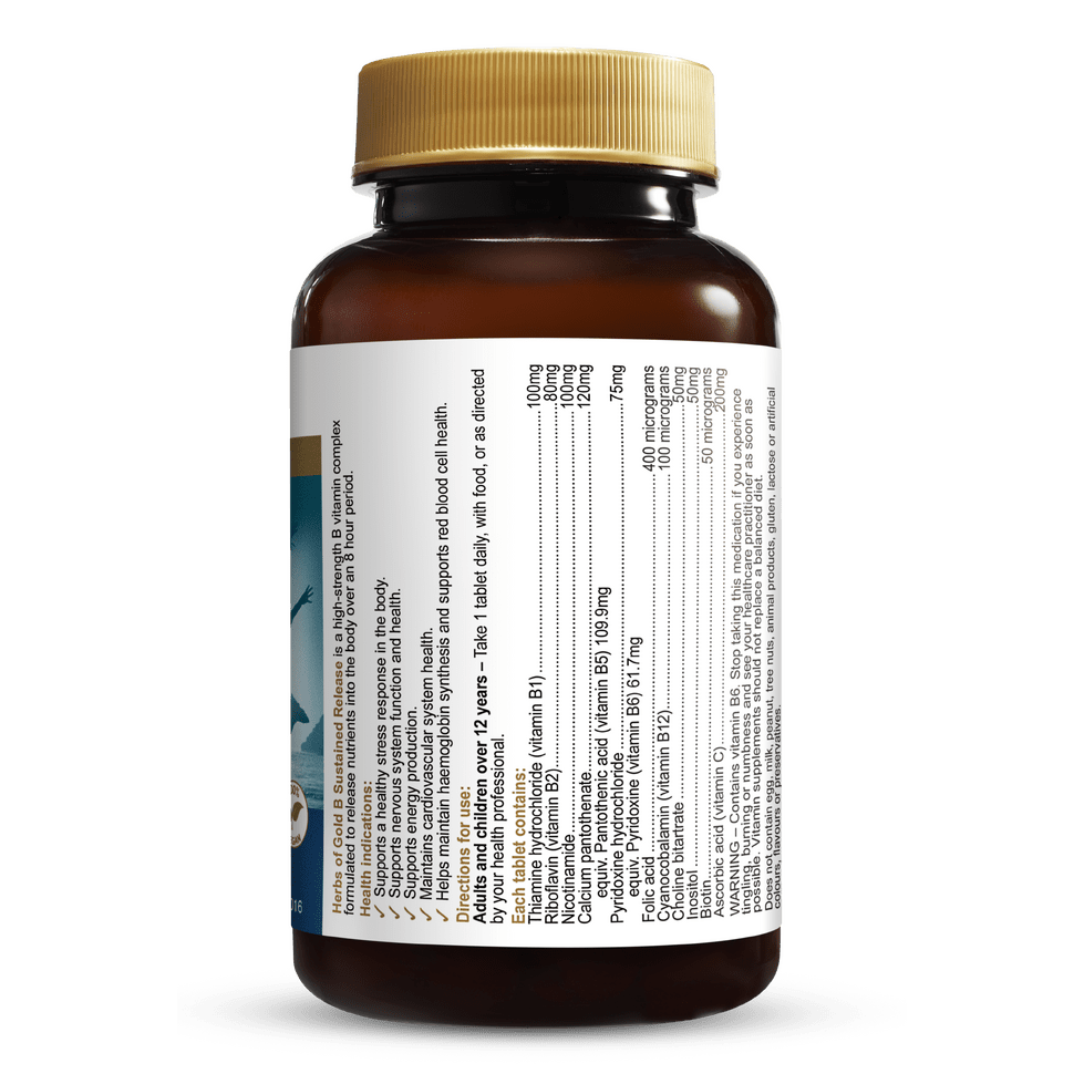Thiamine hydrochloride (vitamin B1) 100mg, Riboflavin (vitamin B2) 80mg, Nicotinamide 100mg, Calcium pantothenate 120mg, equiv. Pantothenic acid (vitamin B5) 109.9mg, Pyridoxine hydrochloride 75mg, equiv. Pyridoxine (vitamin B6) 61.7mg, Folic acid 400mcg, Cyanocobalamin (vitamin B12) 100mcg, Choline bitartrate 50mg, Inositol 50mg, Biotin 50mcg, Ascorbic acid (vitamin C) 200mg.