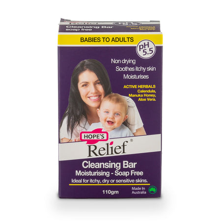Hope’s Relief Soap-Free Cleansing Bar is pH-balanced at 5.5 to mimic the skin. It has no fragrances, chemicals, or irritants. Our cleansing bar helps soothe, moisturise and relieve itchy dry sensitive skin.