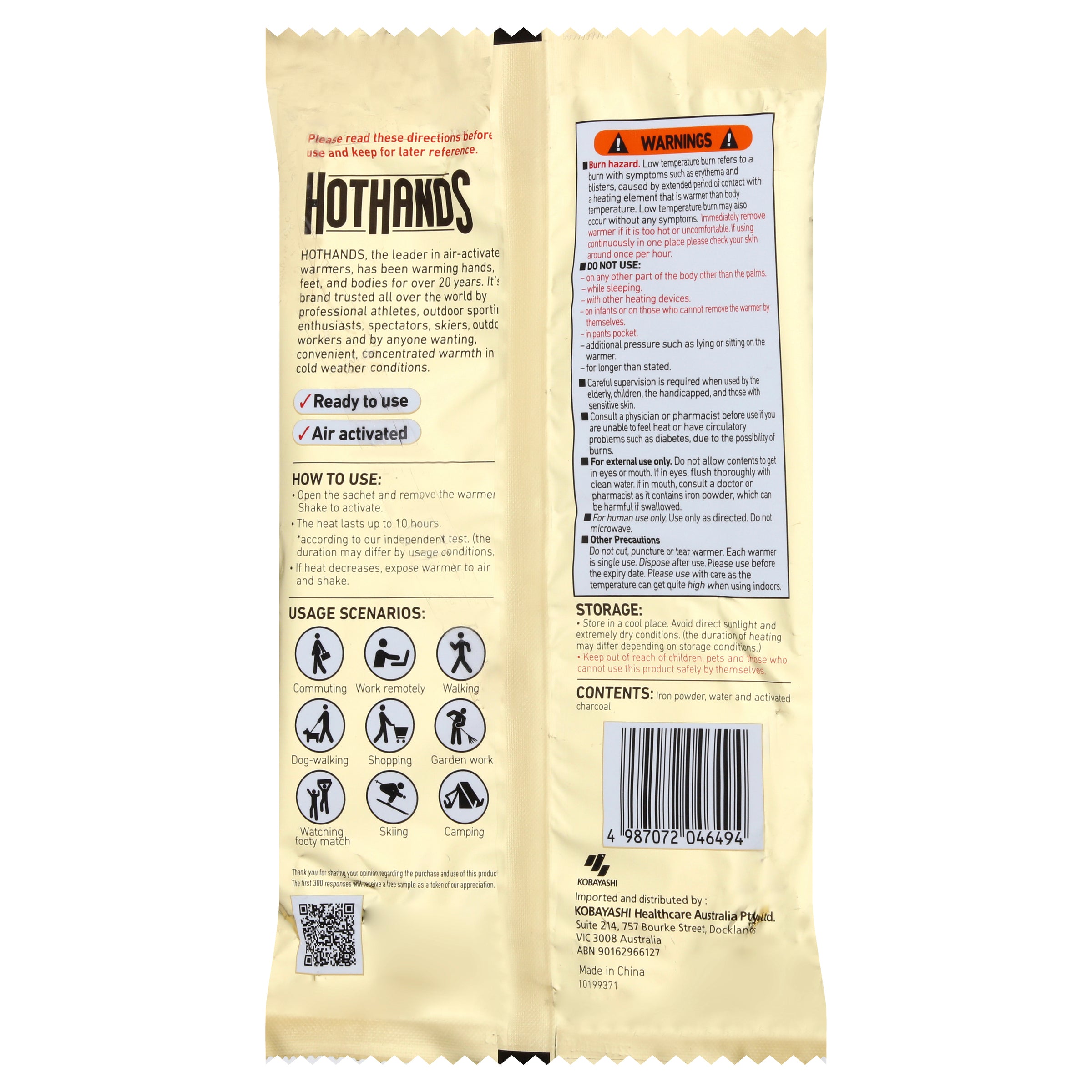 Hot Hands, the leader in air activated warmers, has been warming hands feet and bodies for over 20 Years! The brand trusted all over the world by professional athletes, outdoor sporting enthusiasts, spectators, skiers, outdoor workers, and by anyone wanting safe, convenient, concentrated warmth in cold weather conditions are now available in Australia! Golf and other outdoor sports, whether participating or watching, skiing and snow activities, camping, hiking, winter walks and the great outdoors, refrigerated occupations and construction sites.