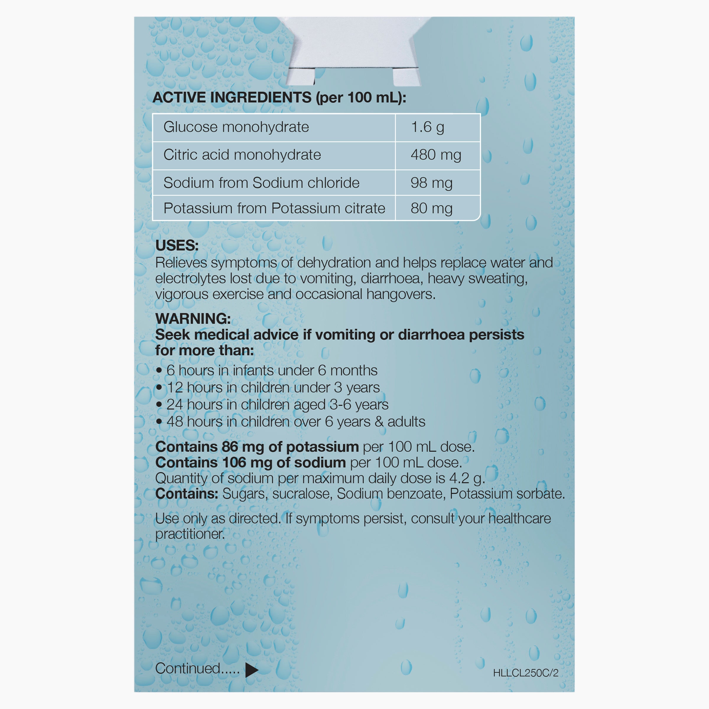 Always read the label. Follow the directions for use. Store below 30 Degrees Celsius. Seek medical advice if diarrhoea persists for more 6 hours in infants under 6 months; 12 hours in children under 3 years; 24 hours in children aged 3-6 years; 48 hours for adults and children aged over 6 years. Warning contains 0.86 mg/ mL potassium, 1.06 mg/ mL sodium. Be aware that dehydration due to vomiting or diarrhoea can be dangerous in babies and children under 5 years old and in elderly people.