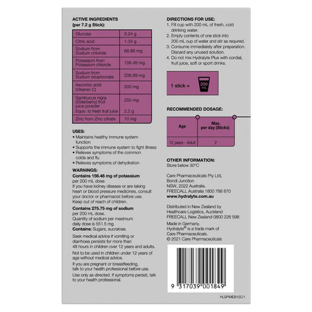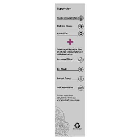 Hydralyte Plus Immunity with Vitamin C, Zinc, Elderberry - Maintains healthy immune system function. Supports the immune system to fight illness. Relieves symptoms of dehydration.