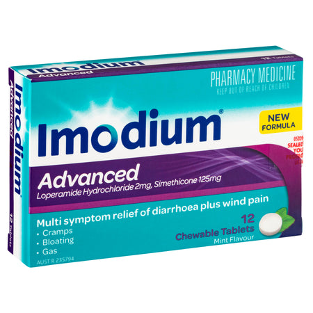 Use Imodium Advanced for: Multi symptom relief of diarrhoea and the pain and discomfort caused by wind including bloating, distension, cramping and flatulence.