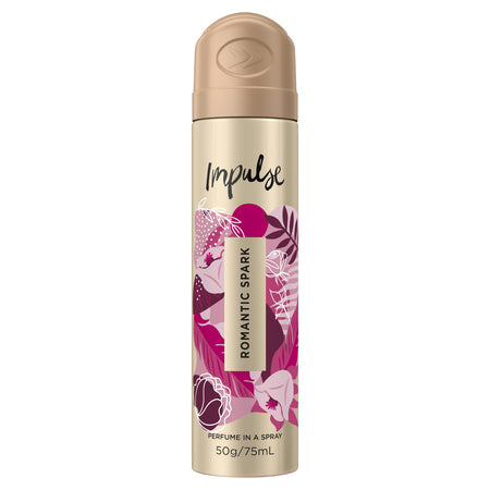 Romantic Spark is a love story of wild violets and warm earthy woods. It's a fragrance embodying the current of electricity that prompts two total strangers to feel as though they've met before. Thrillingly floral, poetically feminine and above all, passionate. Some call it chemistry. Some call it magic. Impulse offers a range of daily fragrances crafted by the worlds best fragrance houses. The aerosol spray is in a light, portable design making the product handy for on the go moments at school, gym, work and overnight bags etc. To use, first twist the top cap to unlock. After press down on the head of the product. Lastly, spray it anywhere, any time. For optimal results, hold can 15 cm from body and spray. Impulse - an everyday perfume in a spray. Familiar yet still uniquely different, Impulse is abandoning the pre-conceived ideas of what a fragrance should be. Designed to suit your personality and busy, on the go lifestyle. Available in nine unique scents, spray on bare skin after hopping out of the shower for an uplifting fragrant boost and then throw into your handbag to top up your scent throughout the day.Boxed Contents: 75ml