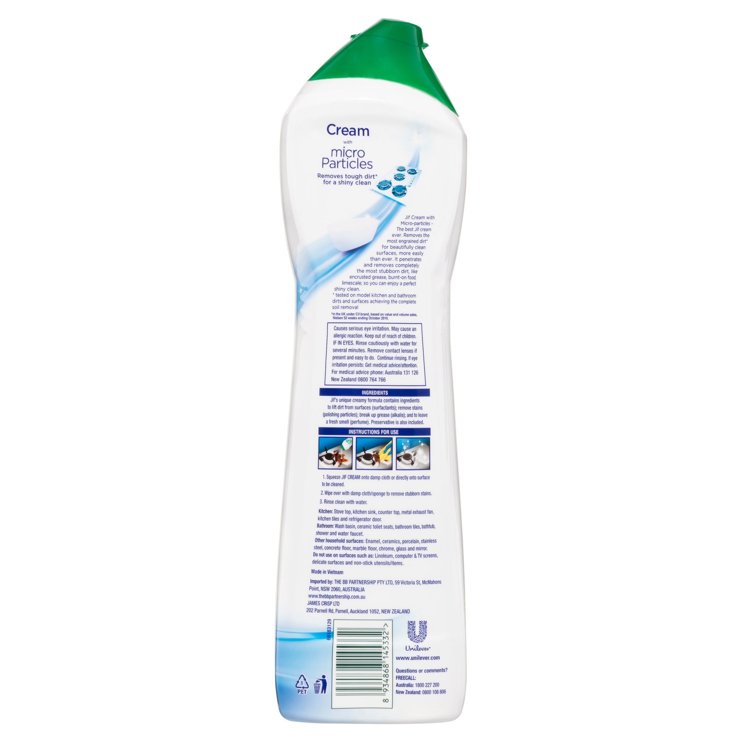 UK's # 1 cream cleanser (in the UK under Cif brand based on value and volume sales, Nielsen 52 weeks ending October 2019).Jif Cream with Micro-particles -The best Jif cream ever. Removes the most engrained dirt (tested on model kitchen and bathroom dirts and surfaces achieving the complete soil removal) for beautifully clean surfaces, more easily than ever. It penetrates and removes completely the most stubborn dirt, like encrusted grease, burnt-on food, limescale; so you can enjoy a perfect shiny clean.