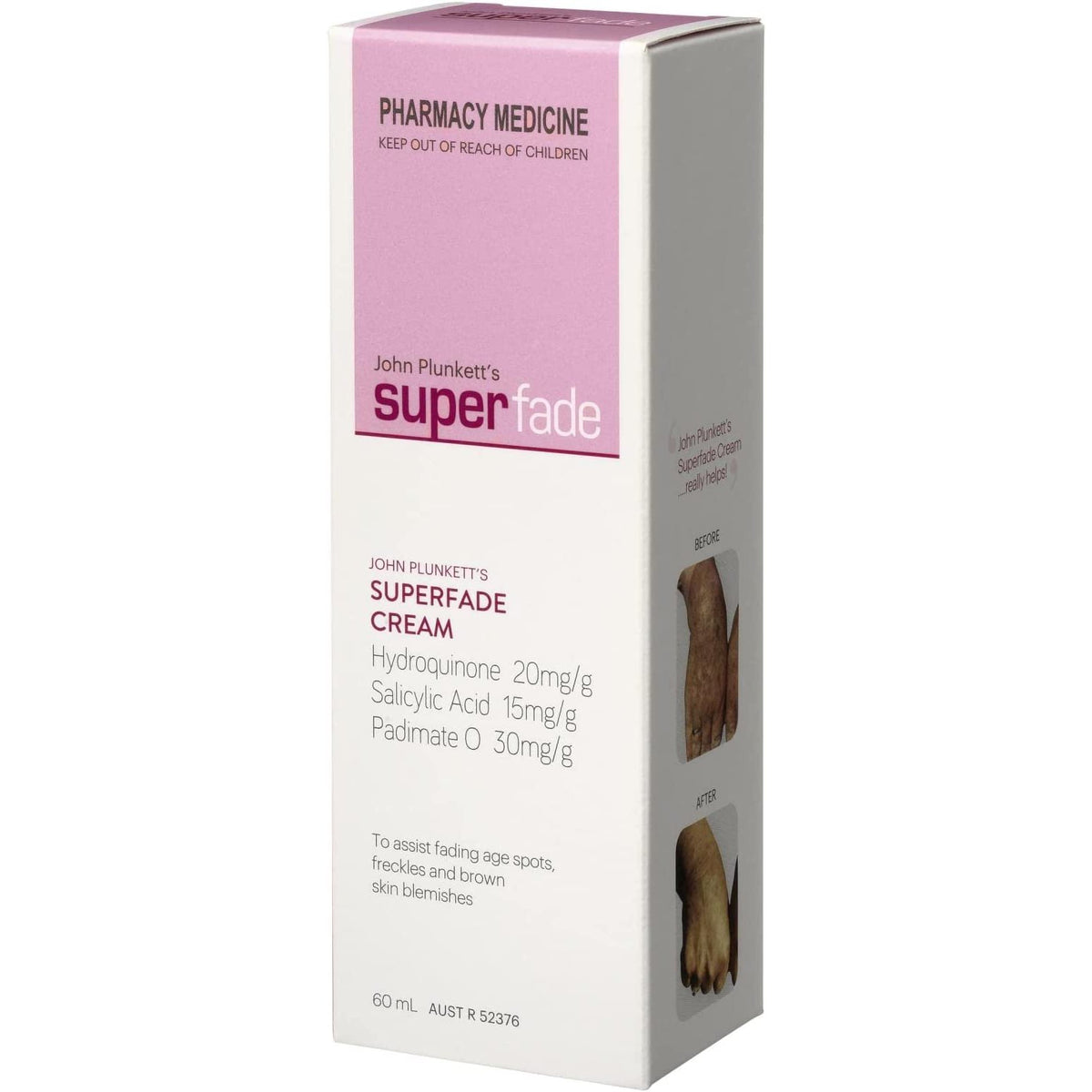 SuperFade Cream is a medicated, pharmacy strength skin treatment to help fade pigmentation, such as age spots, freckles and brown skin blemishes on the hands and body. It contains a powerful active ingredient Hydroquinone (2%), for fighting pigmentation at the source. You should see effective results in 6 weeks.