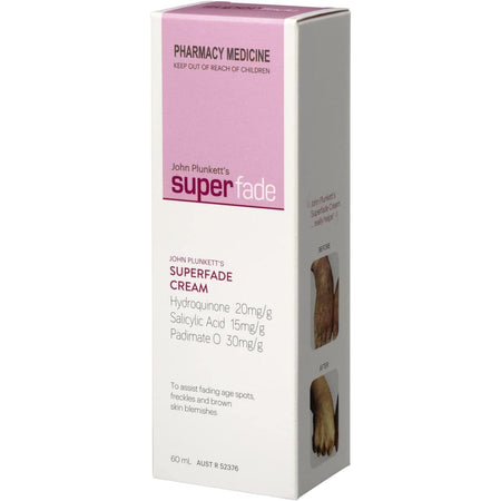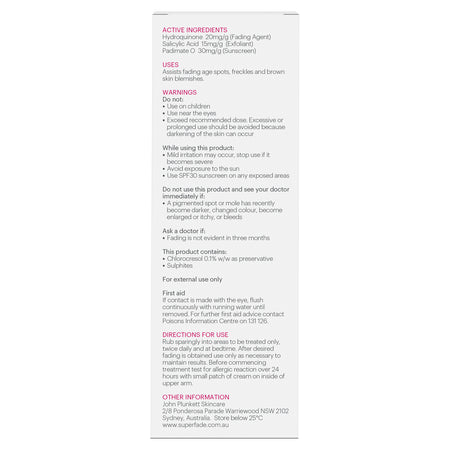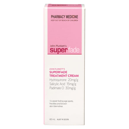 • ABOUT HYDROQUINONE Hydroquinone is the gold standard in pigmentation fading. It works by disabling the damaged melanocyte deep in the skin that produces excess melanin which then forms the brown pigment on the surface of the skin. SuperFade Cream and SuperFade Face Treatment Cream are the only (non-prescription) pharmacy medicines in Australia which contain the powerful active ingredient Hydroquinone.Warnings