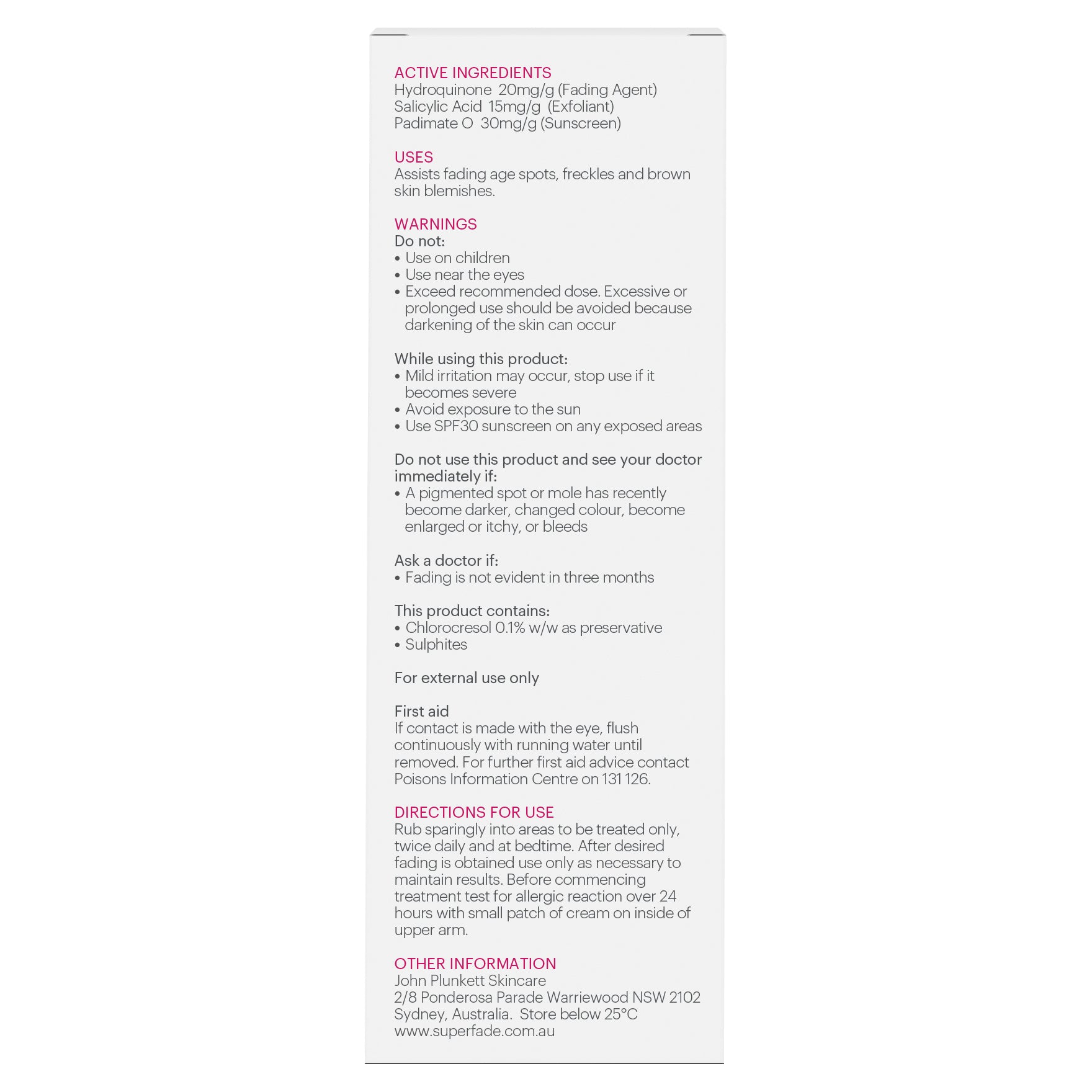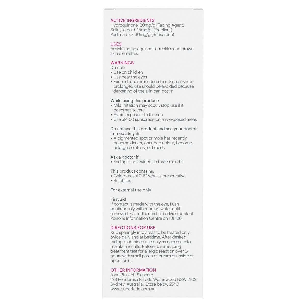 If a pigmented spot or mole has recently become darker, changed colour, become enlarged or itchy, or bleeds do not use this product, see your doctor immediately. Do not use on children. Do not use near the eyes.Mild irritation may occur; stop use if it becomes severe. If fading is not evident in three months, seek doctor's advice. Do not exceed recommended dose. Excessive or prolonged use should be avoided because darkening of the skin can occur. Keep out of the reach of children. Always read the label. Follow the directions for use.