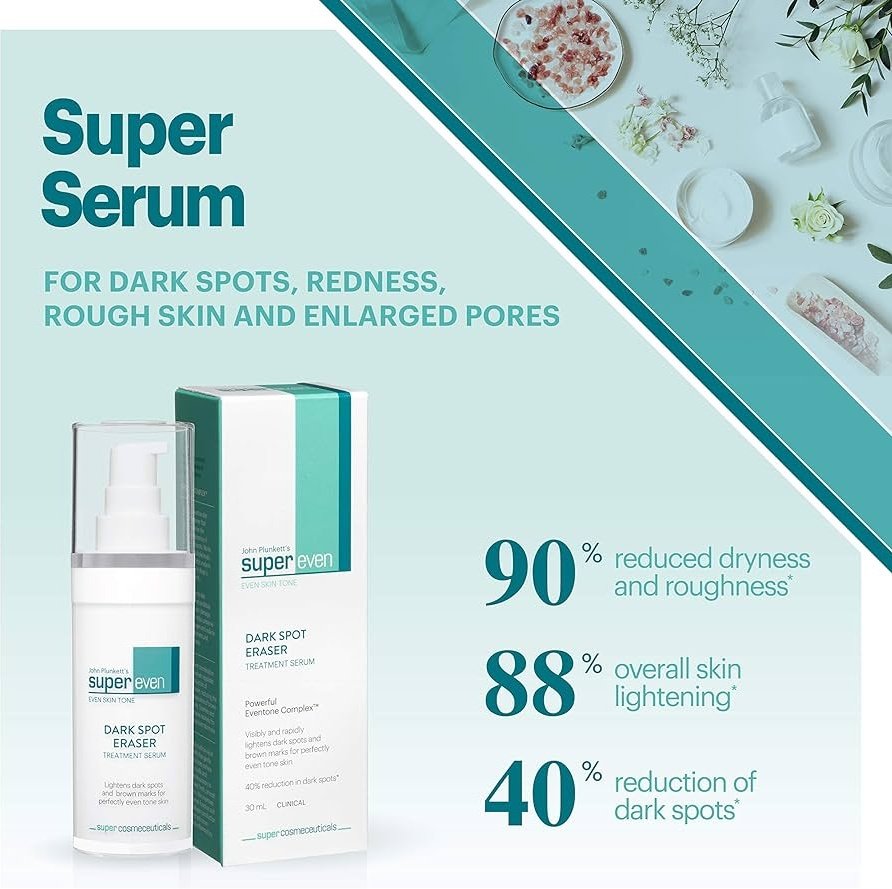 John Plunkett's SuperEven Dark Spot Eraser Serum is formulated to target dark spots, reduce redness, firm skin, and improve skin texture to deliver an even skin tone.