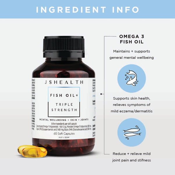 JSHealth Fish Oil+ Triple Strength capsules deliver 3 times more EPA and DHA than regular strength capsules, giving you superior support for optimal heart and brain health. Each capsule contains a natural, molecularly distilled, concentrated fish oil that is sourced sustainably from Alaska. Get the omega-3 you need in a single, potent dose.