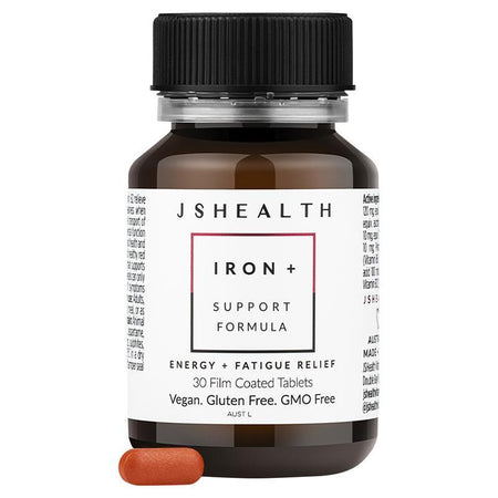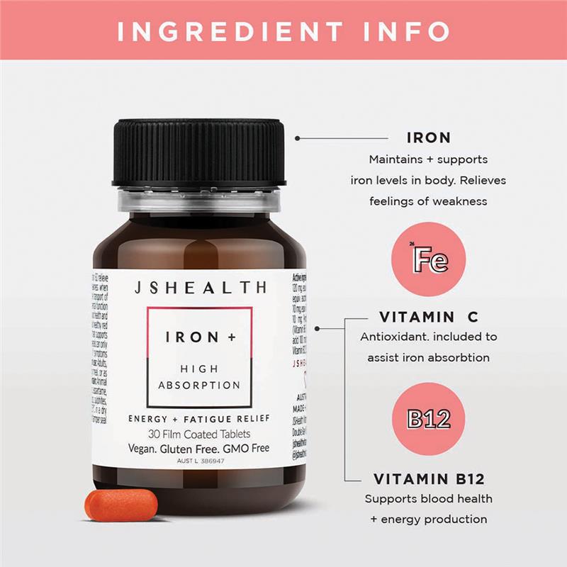 Contains: The JSHealth Iron+ formula contains iron, B Vitamins, Folate, and vitamin C. Vegan formula.
