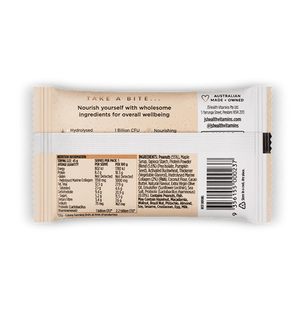 Bursting with 8.2g plant Protein, 1 billion CFU Probiotics and 3.4g Fibre to nourish the body, plus 1.35g of the purest, bioavailable source of Marine Collagen to support healthy skin and make you glow! Activated buckwheat adds a delicious crunch to this peanut butter-based bar.