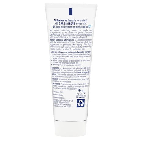 Kenkay Sorbolene with Vitamin E is a gentle moisturiser with the added benefit of Vitamin E that helps fight the appearance of premature skin ageing. This light moisturiser is a pH balanced formula that provides long lasting moisture to relieve dry and scaling skin.