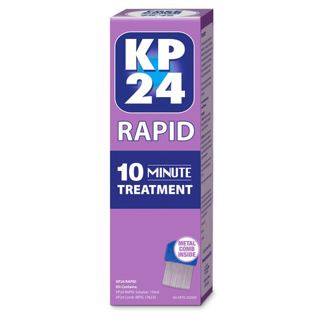 What is KP24 Rapid 150mL for?KP24 RAPID is different to traditional head lice treatments as it has a physical action towards the lice. It kills the head lice by dehydrating them rapidly and suffocating them. A metal comb is included to physically remove the lice from the scalp. KP24 RAPID also contains tea tree and eucalyptus oil which have a repellent effect on head lice. After treatment, it leaves the hair soft and shiny.