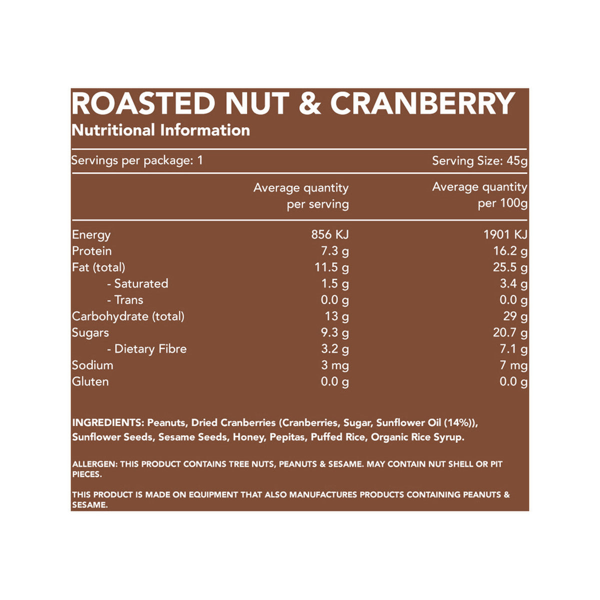 Peanuts, Sunflower Seeds, Cranberries (min 14%), Sesame Seeds, Honey, Pepitas, Puffed Rice, Organic Rice Syrup
