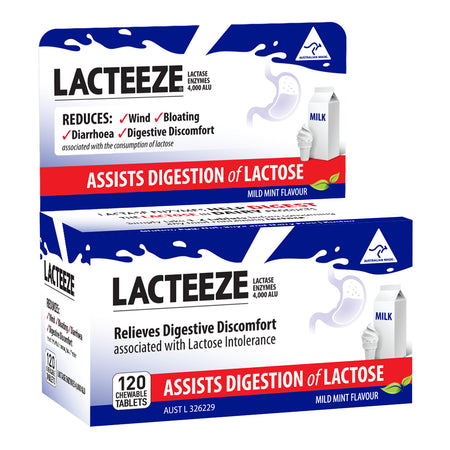 Lacteeze aids the digestion of dairy. Lacteeze lactase enzymes provide effective relief of gas, bloating, abdominal cramps and diarrhoea associated with the digestion of dairy. Lacteeze temporarily increases the amount of lactase enzymes in the digestive system, so that the lactose in dairy can be digested naturally.