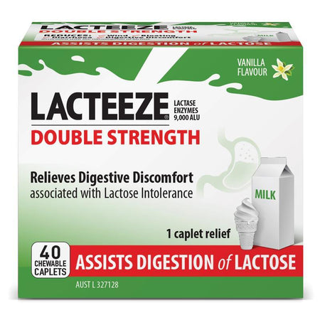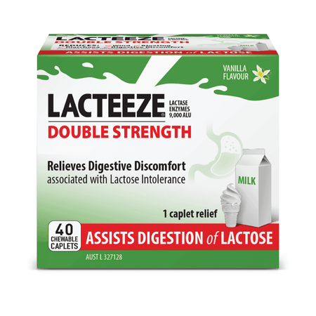 Lacteeze aids the digestion of dairy. Lacteeze lactase enzymes provide relief of gas, bloating, abdominal cramps and diarrhoea associated with the digestion of dairy. Double strength for 1 caplet relief!