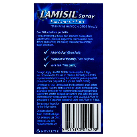 An anti-fungal product is necessary to treat tinea. The active ingredient of Lamisil Sprays, terbinafine fights the infection by not only preventing growth of the fungi, but by killing the fungal cells.