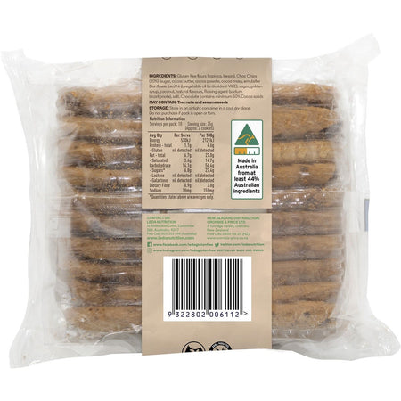 Gluten Free Flours (Tapioca, Besan), Dairy Free Choc Chips (20%) (Sugar, Cocoa Liquor, Cocoa Butter, Emulsifier (Soy Lecithin), Natural Vanilla Flavour), Vegetable Oil (Antioxidant - Vit E Soy), Sugar, Golden Syrup, Coconut, Natural Flavours, Raising Agent (Sodium Bicarbonate), Salt.