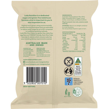 A light and crisp dark chocolate snack made with Australian Dryland Brown Rice, dipped in Leda’s very own vegan Mylk chocolate. Leda Mini Rice Cakes are completely vegan, gluten free and Monash Low FODMAP certified. Best of all, there’s only 16 calories per rice serve.