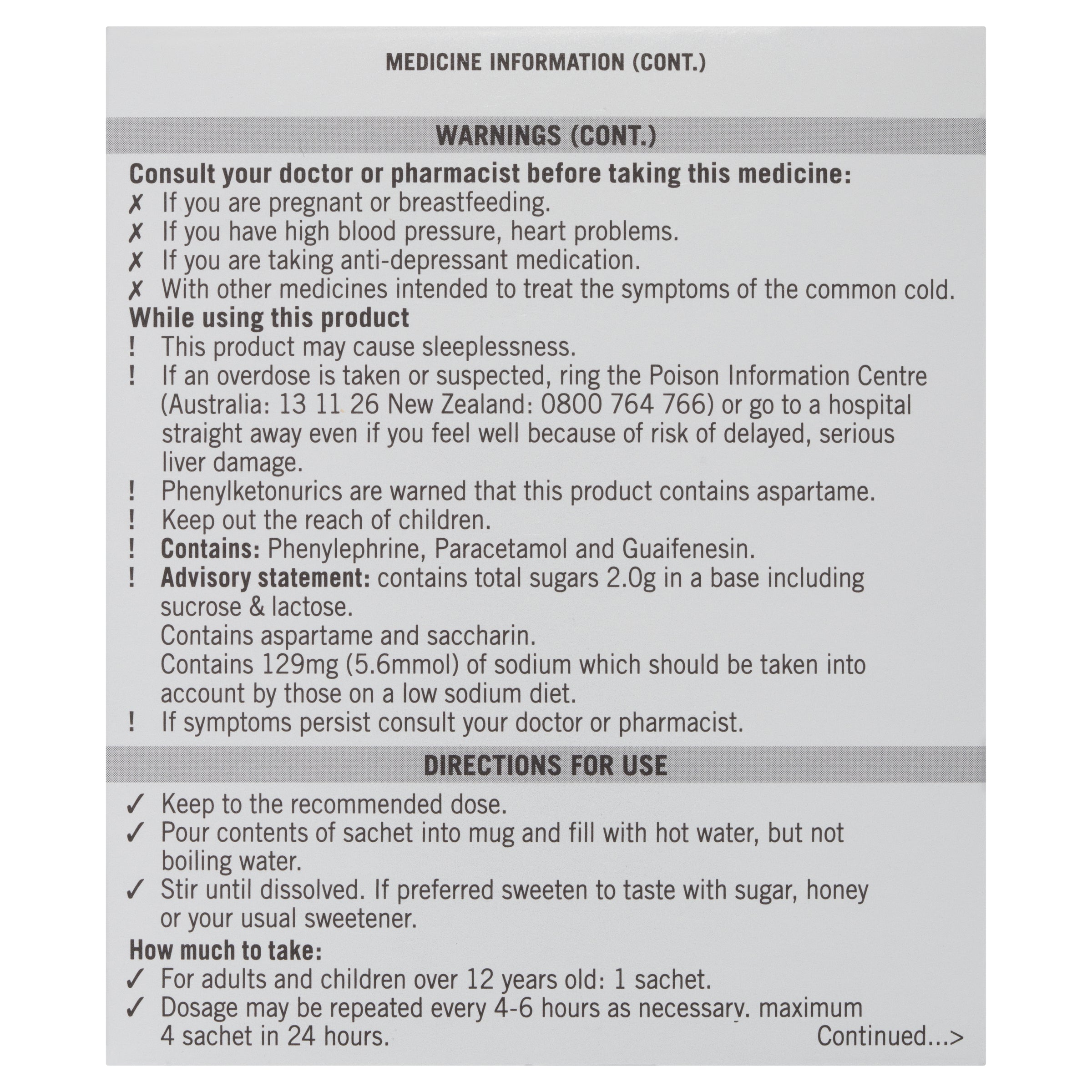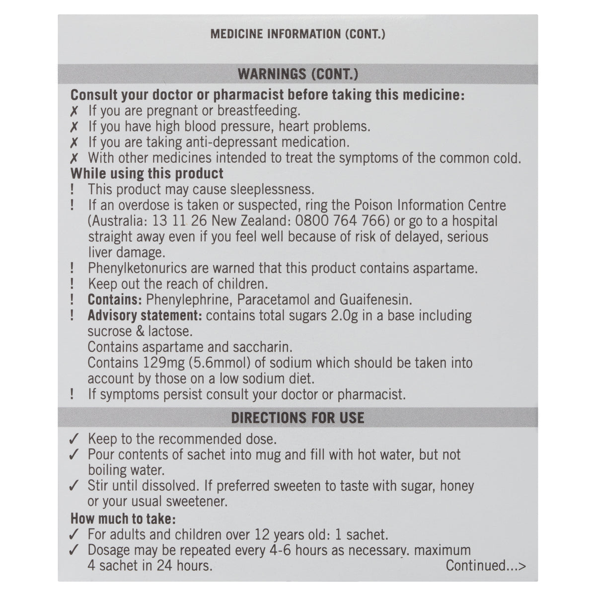 Adults & children over 12 years: 1 sachet. Do not use more than 1 sachet per dose. Do not give to children 12 years and under. Dosage may be repeated every 4-6 hours as necessary (maximum 4 sachets in 24 hours).