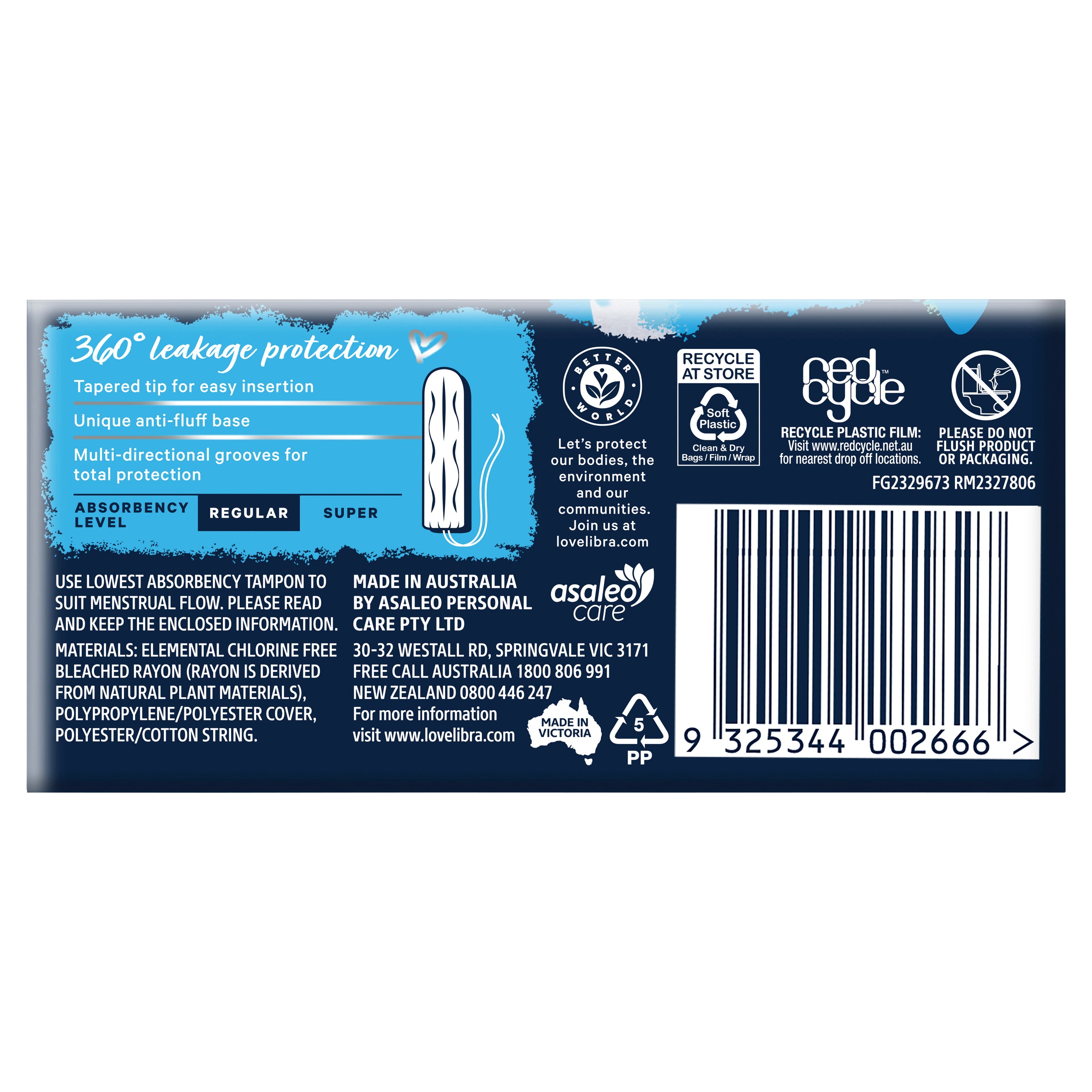 Libra Body Fit tampons are the everyday, go-to tampon with 360° leakage protection. Designed with maximum comfort and protection in mind. A tapered tip makes insertion more comfortable, while our unique anti-fluff base prevents fluffing when releasing the string. The Regular absorbency is ideal for your medium-flow days, usually days 2-3.