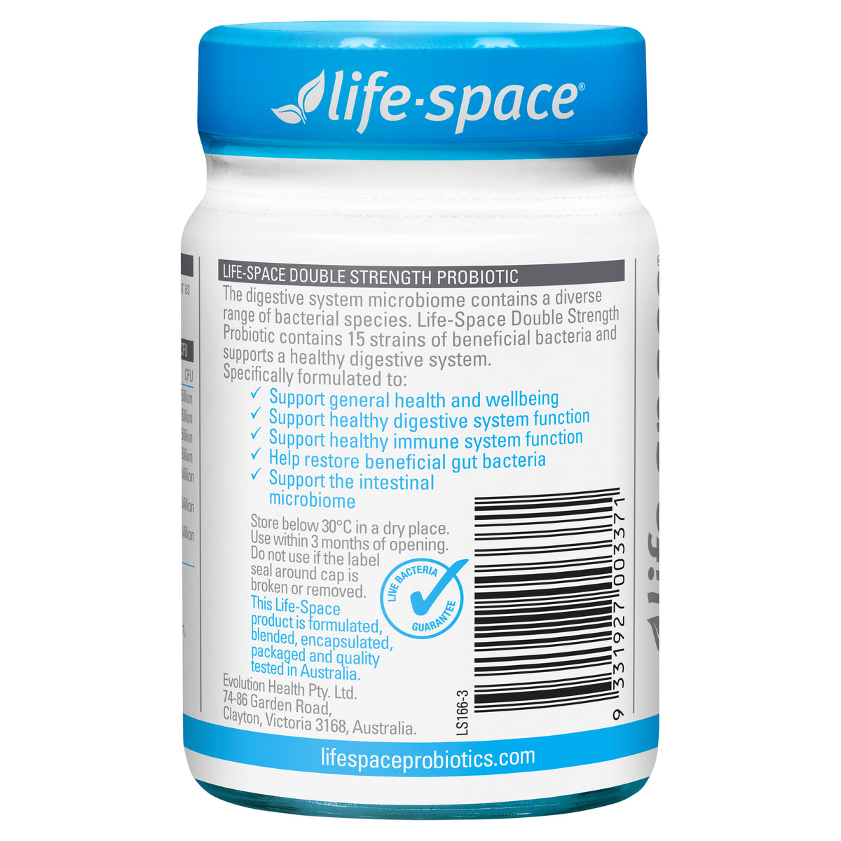 The digestive system microbiome contains a diverse range of bacterial species. Life-Space Double Strength Probiotic contains 15 strains of beneficial bacteria and supports a healthy digestive system.