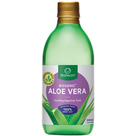 Lifestream Biogenic® Aloe Vera is a digestive tonic that soothes the lining of the stomach and intestines to support smooth and natural digestion. It is sourced from 100% inner leaf gel with no added flavours or sweeteners. The Aloe Vera is organically grown in mineral rich volcanic soil, sustainably harvested by hand and then gently processed using the patented NaturLock™ system.