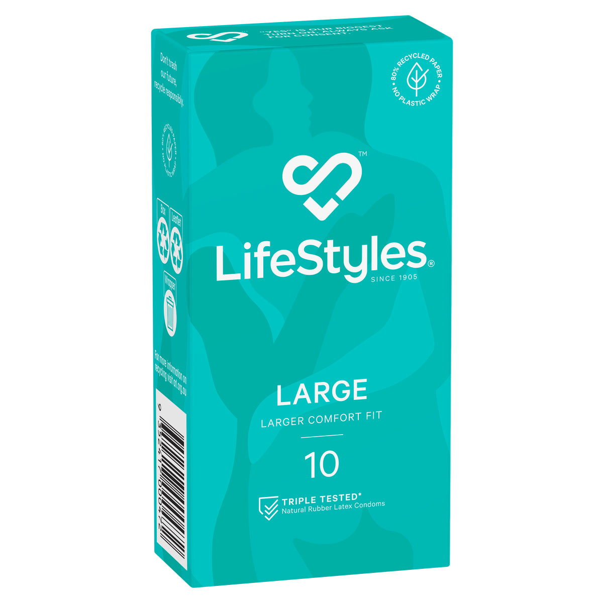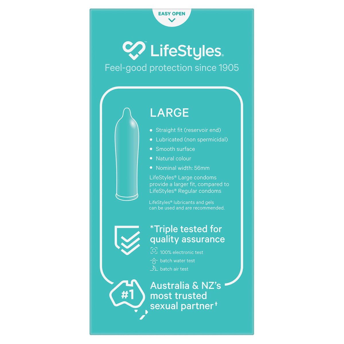 LifeStyles Large Condom is an easy-fit with a reservoir end, lubricated, non-spermicidal, smooth surface, and natural in colour. It has a nominal width of 56mm. Proper use of the condom will help reduce the risk of pregnancy, Sexually transmissible Infections (STI's) and HIV/AIDS.