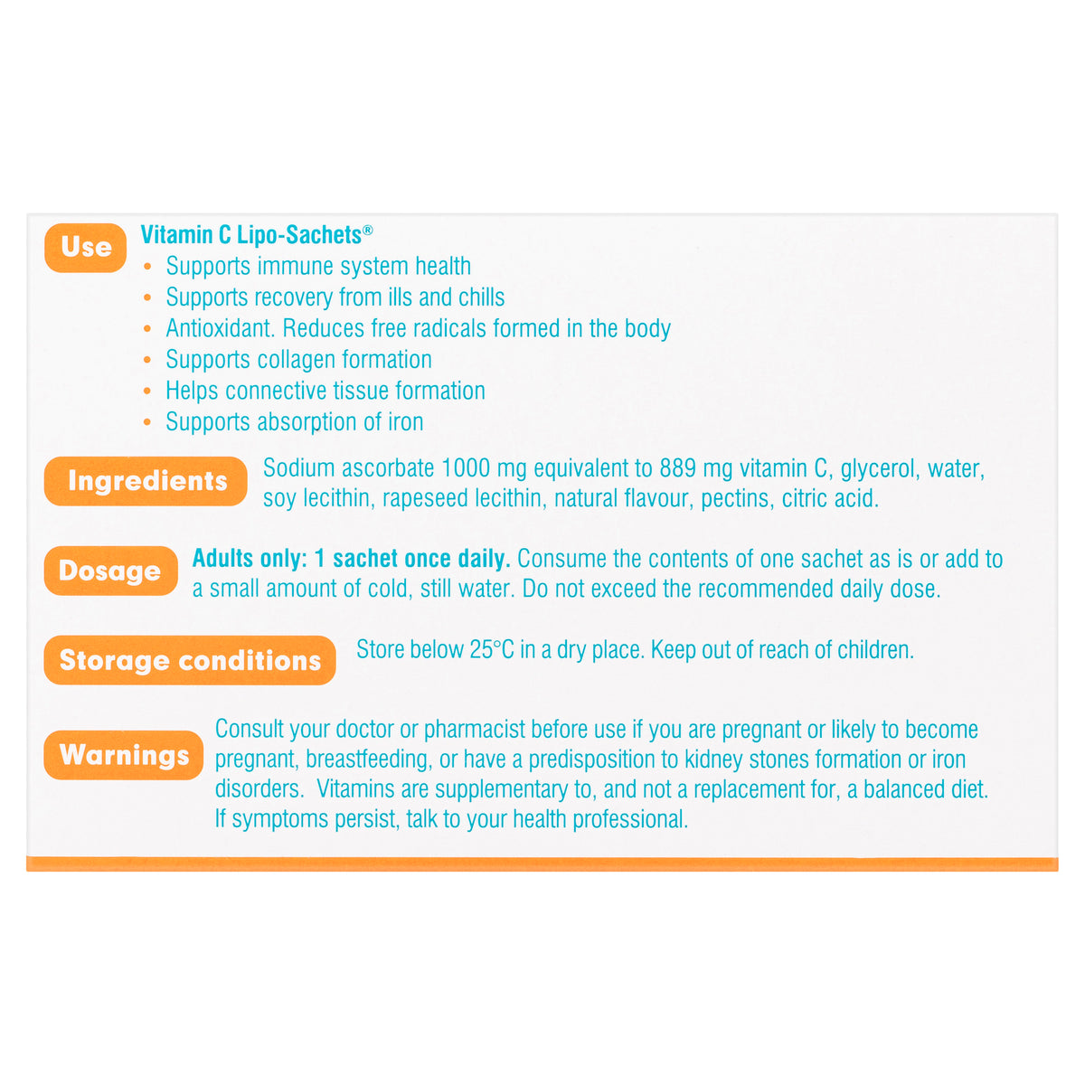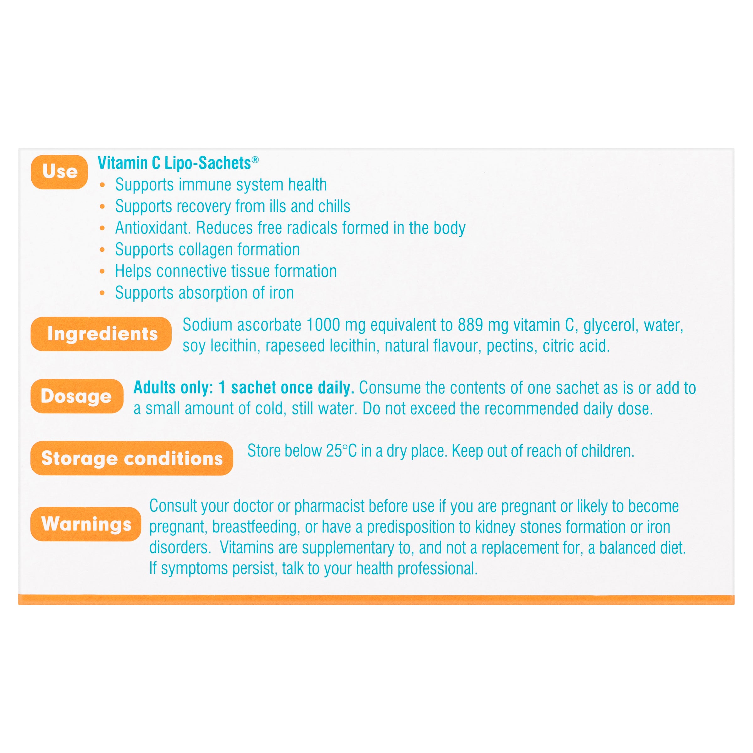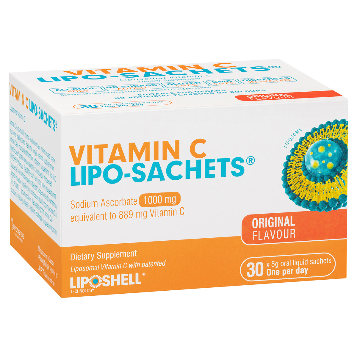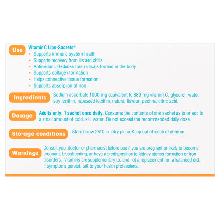 Next-generation vitamin C Lipo-Sachets® use patented LIPOSHELL® technology to provide superior absorption than standard vitamin C supplements (based on a clinical study comparing 10g vitamin C Lipo-Sachets® to 10g standard vitamin C. Ref: M. Lukawski et al. (2019), Journal of Liposome Research, ISSN:0898-2104.) Vitamin C Lipo-Sachets is a once-a-day dietary supplement that contains sodium ascorbate 1000mg (equivalent to 889mg of vitamin C).