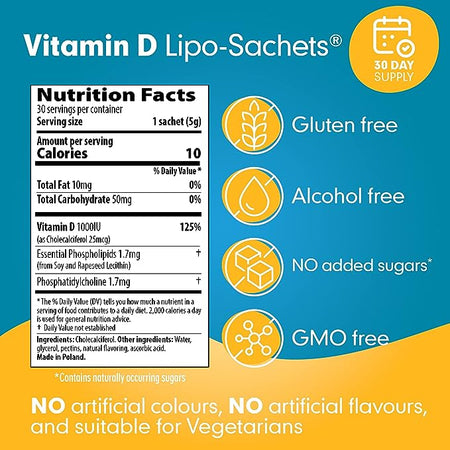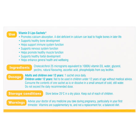 Vitamin D Lipo-Sachets® is a once-a-day dietary supplement containing cholecalciferol 25 micrograms (equivalent to 1000IU vitamin D3).