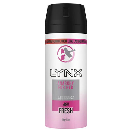 Anarchy for Her is the first and only female Body spray fragrance from LYNX. A bright, fruit fragrance, designed to keep ladies feeling confidently fresh all day long. Top fruity notes of pomegranate, apple, blueberry and kumquat. Followed by middle notes of violet, sage, cedar leaf, lavender and undertones of tobacco wood, sandalwood, white amber and coumarin. Compact enough to carry on the go, Anarchy For Her is the daily fragrance you can rely on and designed to give you confidence. All day long. So you can forget about odour and focus on what really matters. And that's you being, well, you.To Use: shake can and hold can 15cm away from body then spray. Spray on key areas of the body - underarms and upper body. Lynx is committed to producing styling & grooming products that help Australians look better, smell better and feel more confident when taking on the world, and express themselves authentically. Follow @LYNXAUSNZ for Expression Series updates plus news on events and giveaways using hashtag #FINDYOURMAGIC.Anarchy for Her is the first and only female Body Spray fragrance from LYNX.