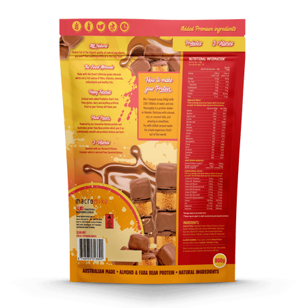 Almond Protein, Faba Bean Protein, Natural Flavours, Coconut Nectar, Himalayan Rock Salt, Coconut Milk Powder, Raw Cacao, Guar Gum, Panmol B Complex, Stevia (Steviol Glycosides), Monk Fruit Extract, Probiotic Lactospore (Bacillus Coagulans).MAC166CPP