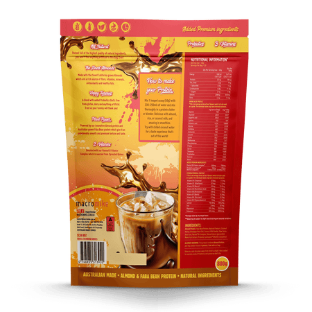 Almond Protein, Faba Bean Protein, Natural Flavours, Coconut Nectar, Himalayan Rock Salt, Coconut Milk Powder, Raw Cacao, Guar Gum, Panmol B Complex, Stevia (Steviol Glycosides), Monk Fruit Extract, Probiotic Lactospore (Bacillus Coagulans).MAC170CPP