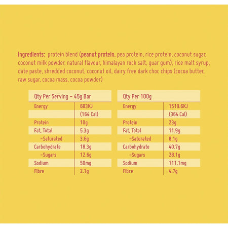 Protein Blend (Peanut Protein, Pea Protein, Rice Protein, Coconut Sugar, Coconut Milk Powder, Natural Flavour, Himalayan Rock Salt, Guar Gum), Rice Malt Syrup, Date Paste, Shredded Coconut, Coconut Oil, Dairy Free Dark Choc Chips (Cocoa Butter, Raw Sugar, Cocoa Mass, Cocoa Powder).MAC31CPP