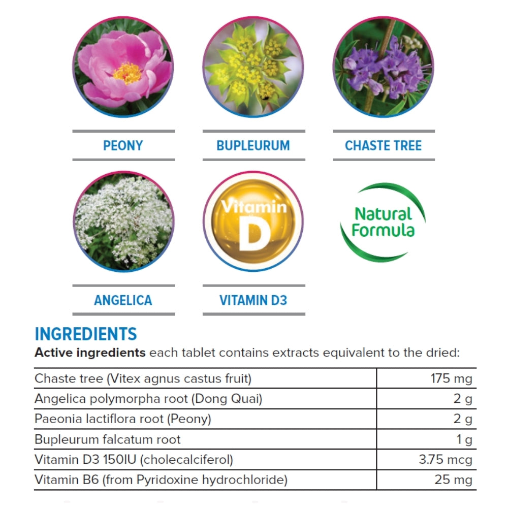 .Each Tablet contains extract equivalent to the dried herbs: Vitex Agnus-Castus Fruit (Chaste Tree): 175mg, Angelica Polymorpha Root (Dong Quai): 2g, Paeonia Lactiflora Root (Peony): 2g, Bupleurum Falcatum Root: 1g. Also including naturally derived excipients: Calcium Hydrogen Phosphate, Cellulose – Microcrystalline, Croscarmellose Sodium, Hypromellose, Silica – Colloidal Anhydrous, Magnesium Stearate, Chlorophyllin – Copper Complex, Carnauba Wax. Tablet coating proprietary ingredient PI 4029. Vitamin D3 150IU (Cholecalciferol): 3.75ug Vitamin B6 (from Pyridoxine hydrochloride): 25m.MP52CPP