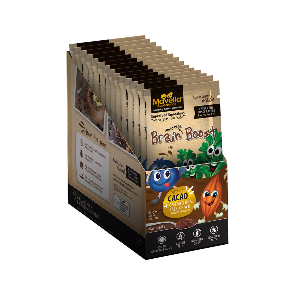Mavella Brain Boost Ingredients contain Omega-3, such as flaxseed and chia. It also contains a wonderful combination of two organic plant proteins that together create an all-round amino acid profile important for growing kids. Also included is the popular all-natural and organic Peruvian superfood Cacao which gives a chocolate taste. Australian made fruits Blueberry and Kale also known for their antioxidant benefits have been added. Plus there are prebiotics, vitamins, and Calcium.