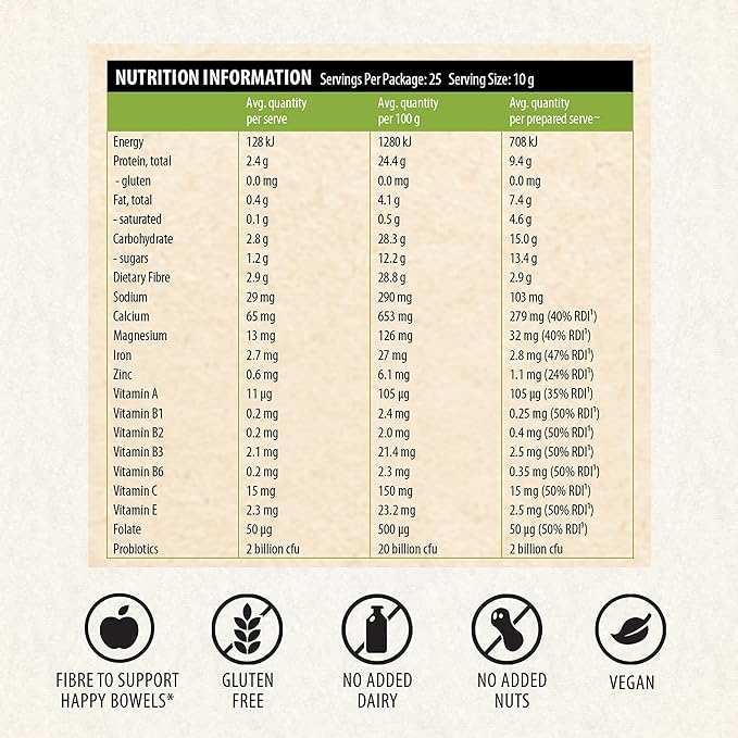 Simply mix 2 teaspoons (10g) of Gut Boost into 250ml of milk daily. Suitable for 12 months and up. Suitable for vegetarians.