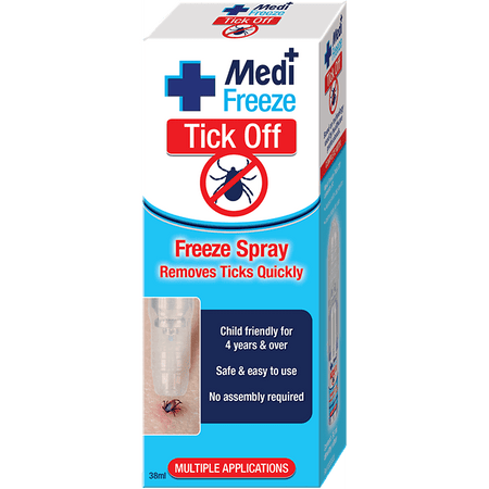 Medi Freeze Tick Off spray removes ticks quickly, 38mL bottle.