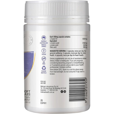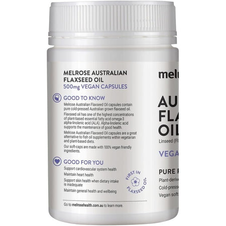 Melrose Organic Flaxseed Oil capsules contain Flaxseed Oil, cold-pressed from organically-grown Australian flaxseeds. Flaxseed oil has one of the highest concentrations of plant-based omega-3 alpha-linoleic acid (ALA) and is an excellent vegan alternative to fish oil. ALA is converted to eicosapentaenoic acid (EPA) and docosahexaenoic acid (DHA) in the body, which are essential fatty acids required for optimal health. Capsules are 500mg in size, for ease of swallowing, and made with vegan caps suitable for vegetarians and vegans.