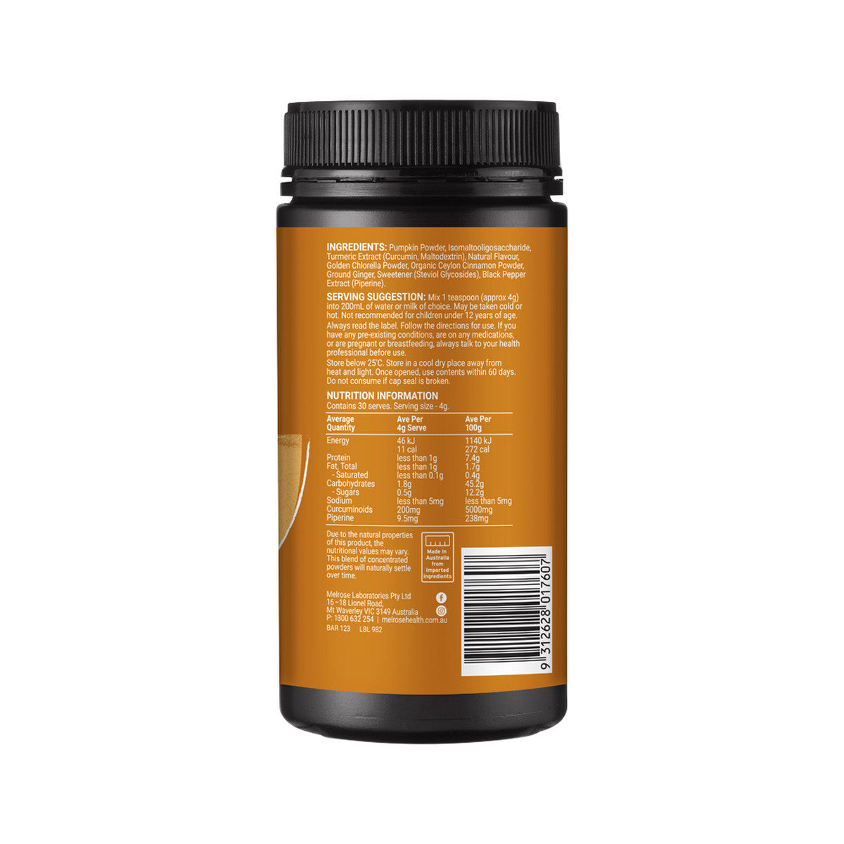 Pumpkin Powder, Isomaltooligosaccharide, Turmeric Extract (Curcumin, Maltodextrin), Natural Flavor, Golden Chlorella Powder, Organic Ceylon Cinnamon Powder, Ground Ginger, Sweetener (Steviol Glucosides), Black Pepper Extract (Piperine).