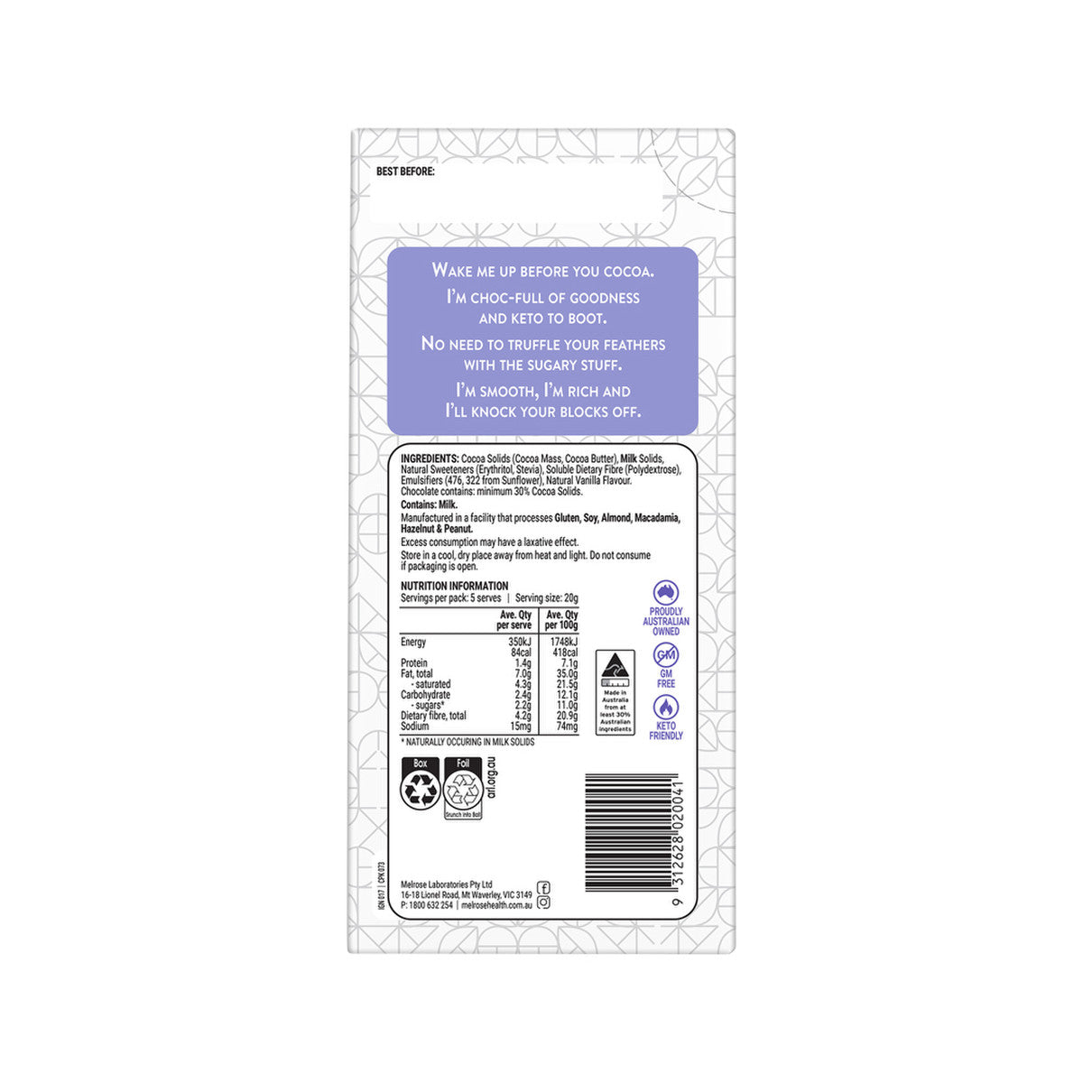 Try Melrose's Ignite Keto Milk Chocolate, perfect for those on a low-carb diet. Each 100 g bar contains only 1.5 g of carbs, and is packed with healthy fats to give your body an ideal energy source. Get 12 bars for an enjoyable eating experience.