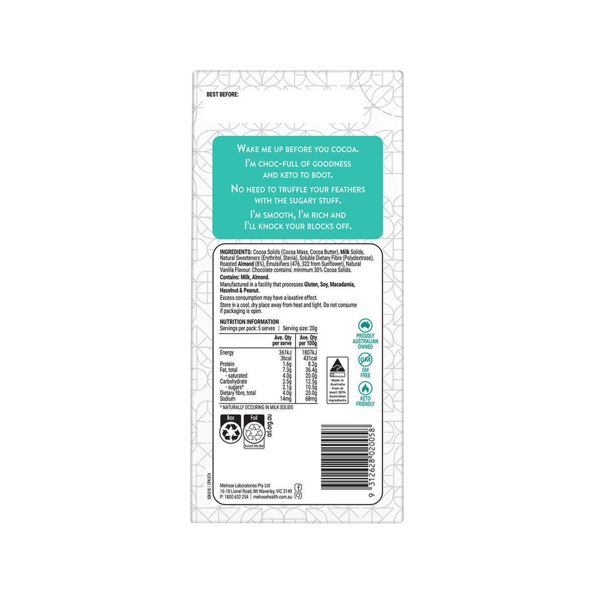 Indulge in this delicious keto-friendly treat with Melrose Ignite Keto Roasted Almond Milk Chocolate. This pack of 12 contains 100g of roasted almond, milk, and cocoa butter - giving you all the flavour with none of the guilt. With only 1g of sugar per serving, it's perfect for those on the ketogenic diet.
