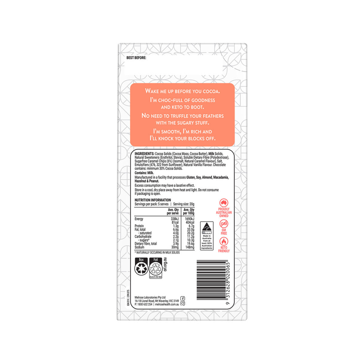 This pack of 12 Melrose Ignite Keto Salted Caramel Milk Chocolate 100g bars is a great way to satisfy sweet cravings while sticking to a keto-based diet. With no added sugar, these bars contain only 3g of carbohydrates per serving, helping you stay on track with your low-carb lifestyle. Enjoy guilt-free satisfaction and satisfy your sweet tooth!