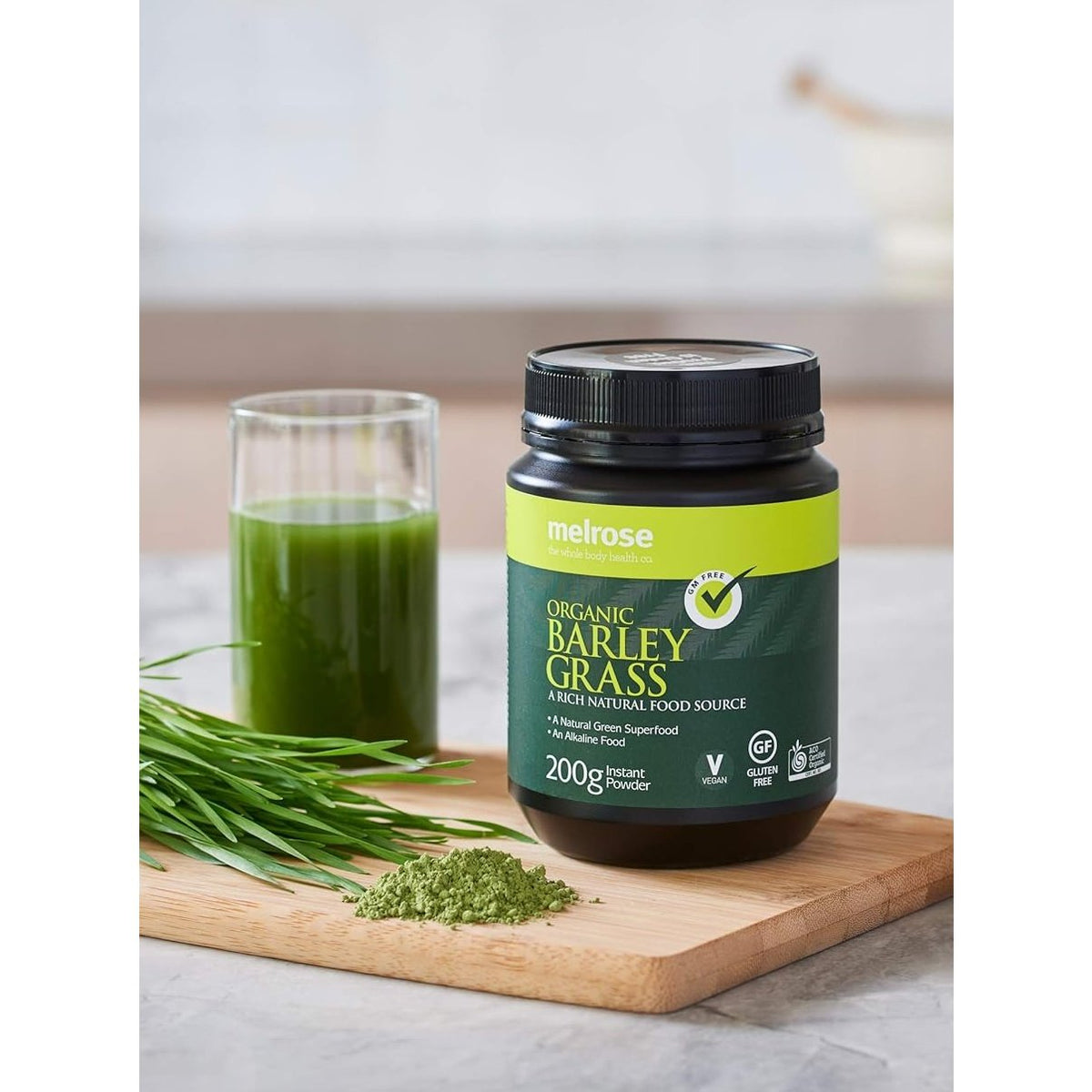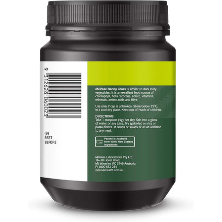 Melrose Barley Grass is a green superfood made from the powdered dehydrated leaves of organically grown young barley plants, providing a good supplement for diets deficient in green vegetables. Barley Grass naturally contains dietary fibre, minerals, vitamins, antioxidants, chlorophyll and folate, an essential B vitamin.