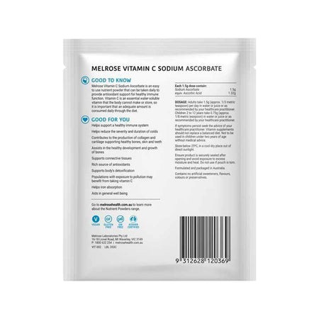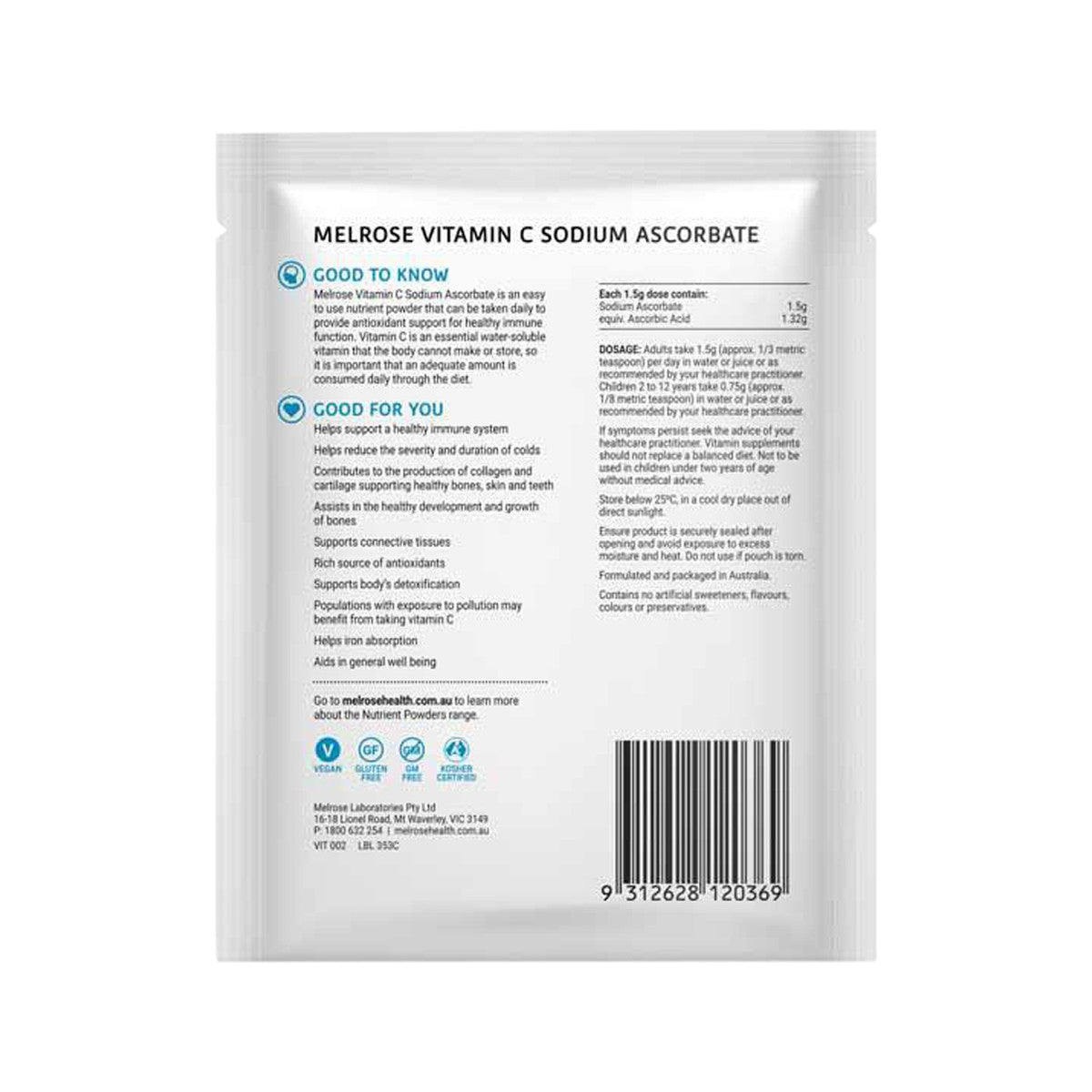Melrose Vitamin C Sodium Ascorbate is an easy to use nutrient powder that can be taken daily to provide antioxidant support for healthy immune function. Vitamin C is an essential water-soluble vitamin that the body cannot make or store, so it is important that an adequate amount is consumed daily through the diet.