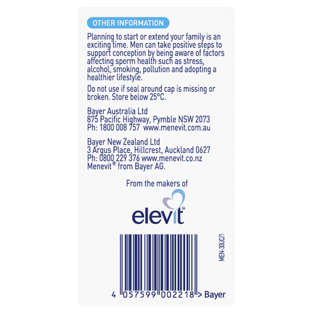 Planning for a baby? Menevit Pre-Conception Sperm Health is a supplement specially formulated to support sperm health for couples planning pregnancy. It contains a range of antioxidants that support sperm production, sperm motility and reduce free radicals in the body.Sperm take up to 3 months to fully mature, so start taking Menevit daily for 3 months prior to trying for a baby until you conceive.
