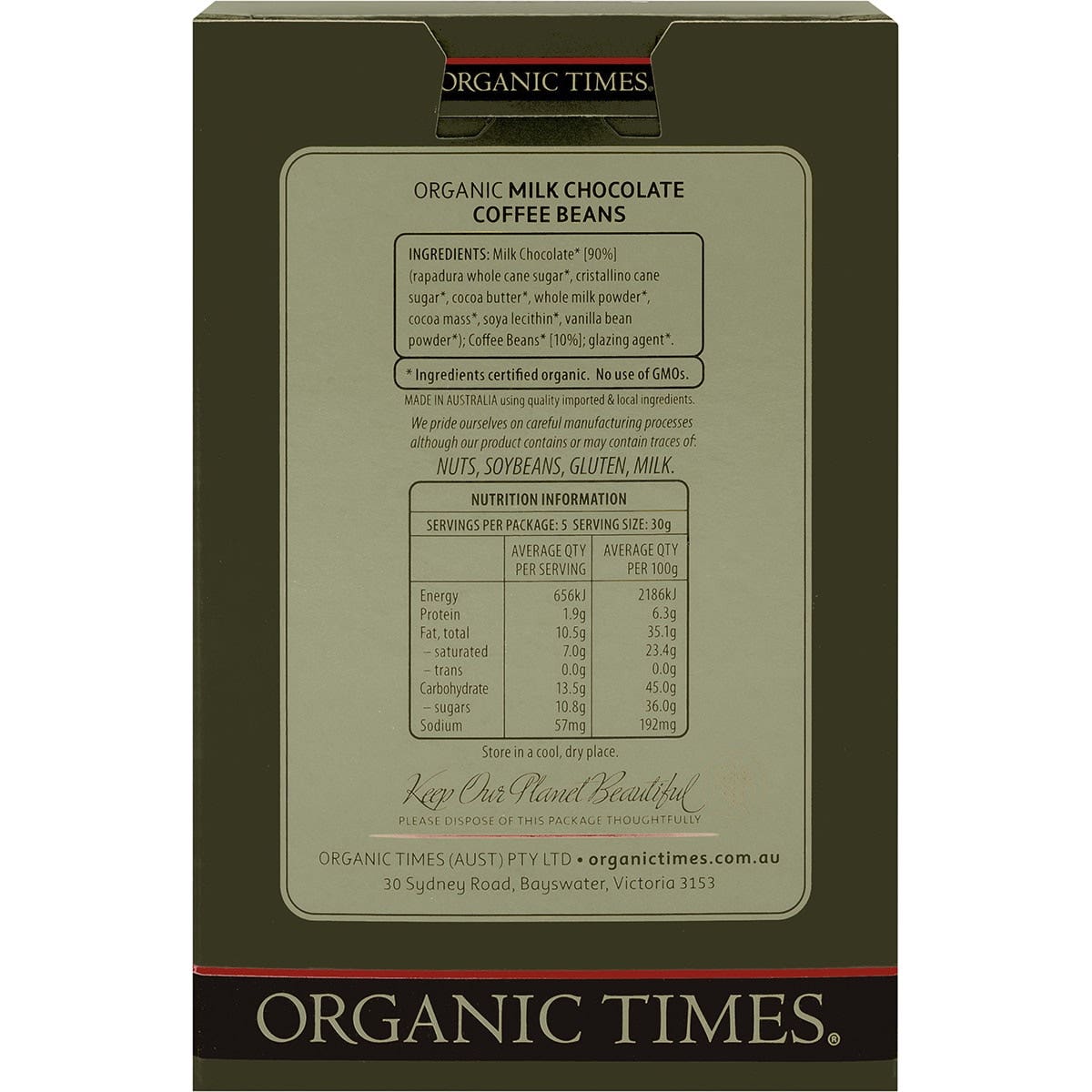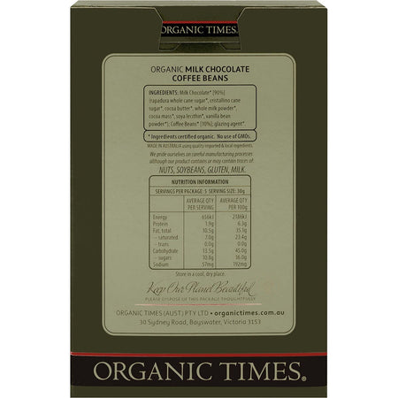ORGANIC TIMES Milk Chocolate Coffee Beans 150g