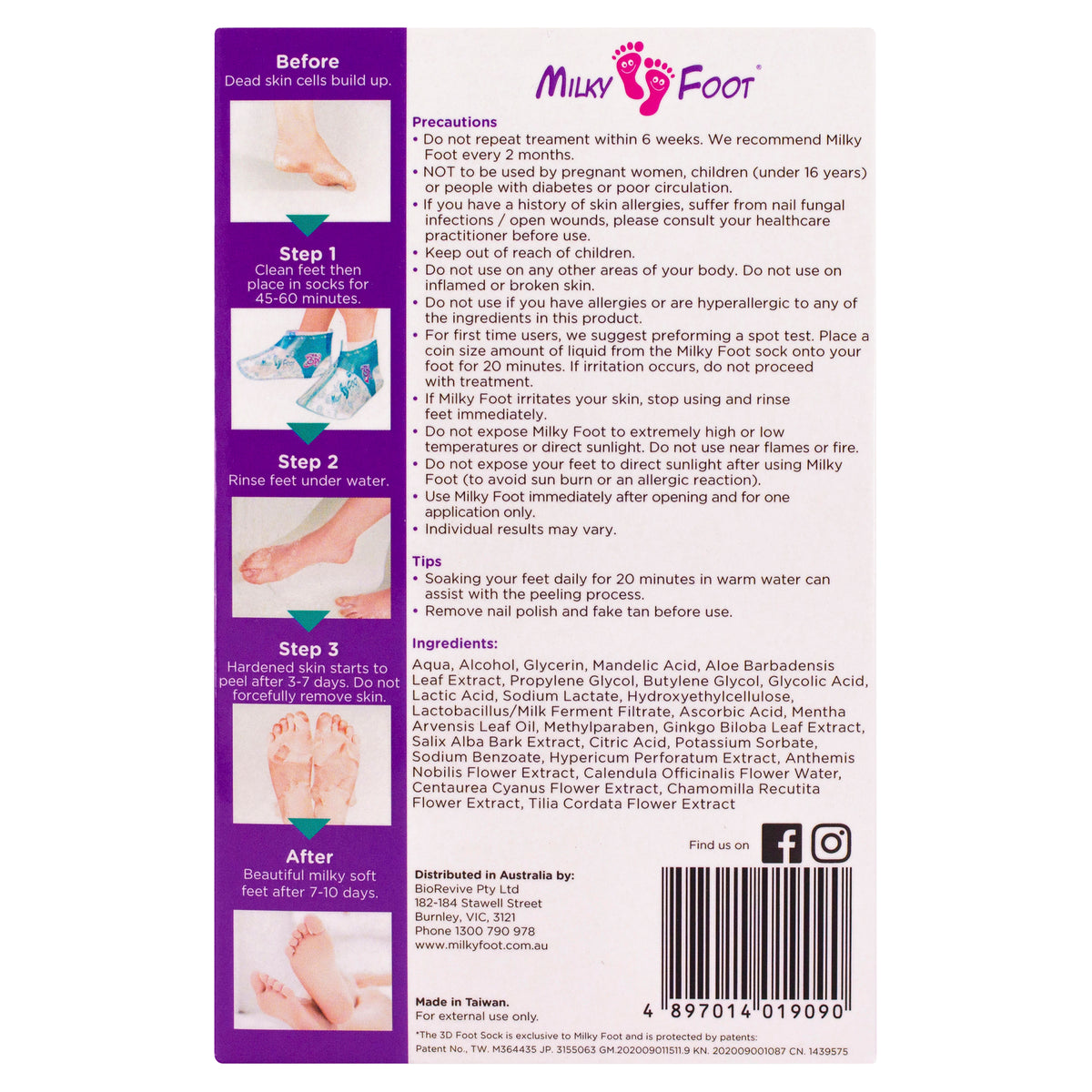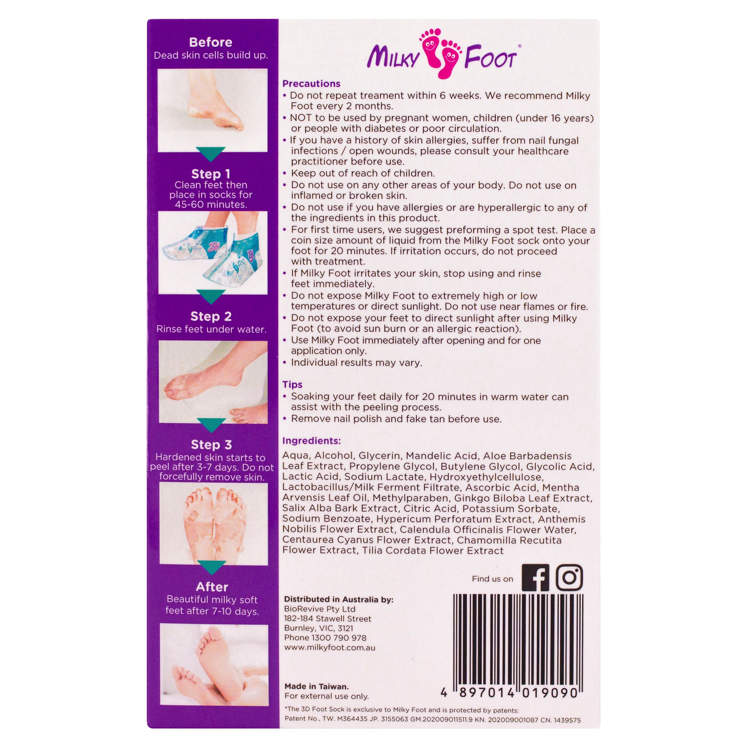 1. Cut along dotted lines of Milky Foot Intense Exfoliating Foot Pads (socks) and then place on freshly washed feet. Use Milky Foot’s tabs to secure by folding over the socks around the front of your ankle and stick down.
