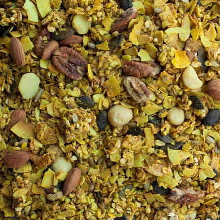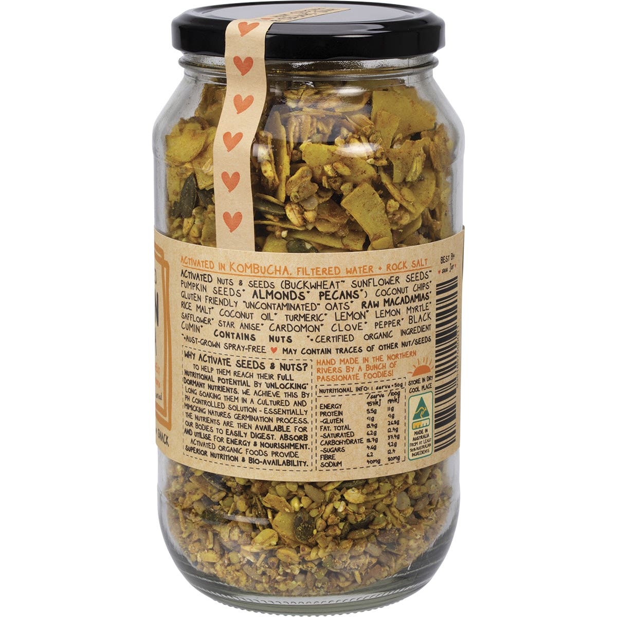 Activated Nuts & Seeds (Buckwheat, Sunflower Seeds, Pumpkin Seeds*, Almonds*, Pecans*), Coconut Chips*, Gluten Friendly "Uncontaminated" Oats*, Raw Macadamias*, Rice Malt*, Coconut Oil*, Turmeric*, Lemon*, Lemon Myrtle*, Safflower*, Star Anise*, Cardamon*, Clove*, Pepper*, Black Cumin*. *Certified Organic Ingredient.